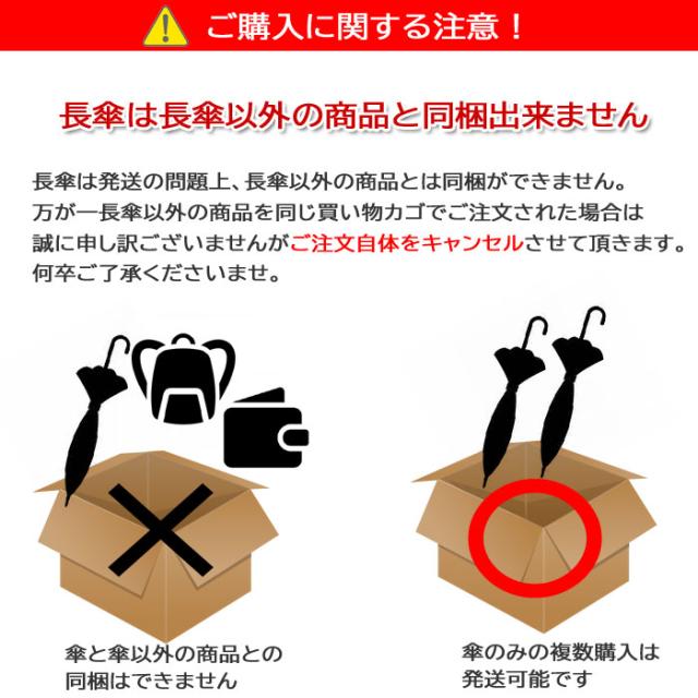 ※こちらは傘と傘以外の商品との同梱発送は発送の問題上出来ませんので予めご了承ください。もし同じ買い物カゴにいれてのご購入の場合、ご注文自体をキャンセルさせていただきます。
