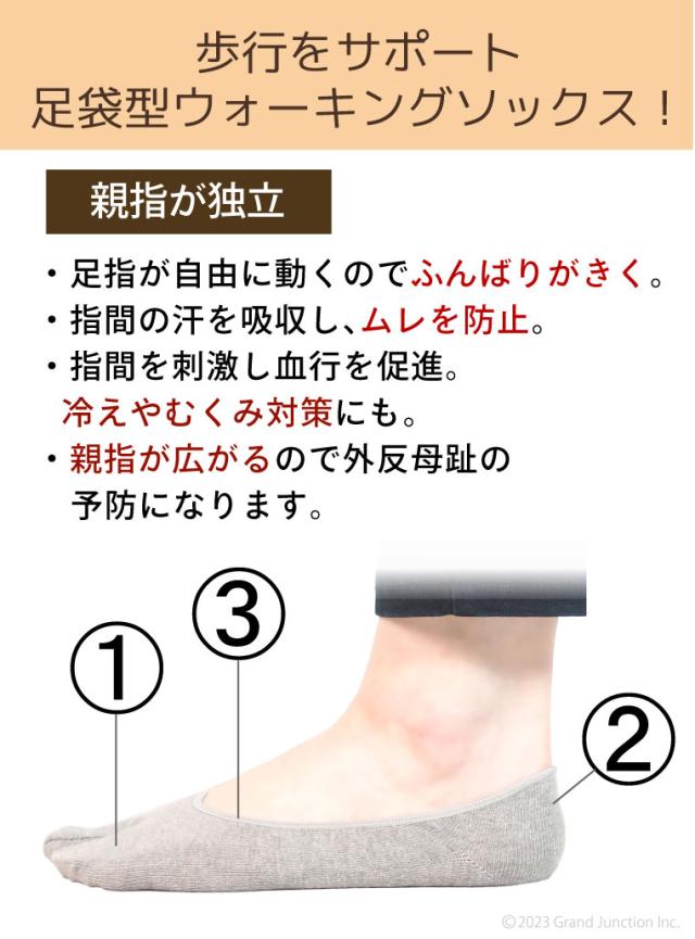 ■親指が独立している足袋型ソックスは、親指が自由に動かせるので足指で地面をとらえる歩き方ができます。 それによって指が鍛えられるので外反母趾の予防や、疲れにくい正しい歩行がしやすくなるといった効果があります。