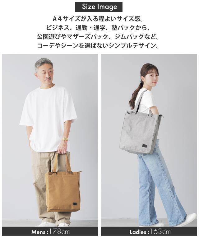 大容量、軽量のA4サイズのユニセックストートバック。通勤や通学、塾バックなど、デイリーに使い回しがしやすいシンプルなデザインの肩掛けができる縦型のトートバックです。