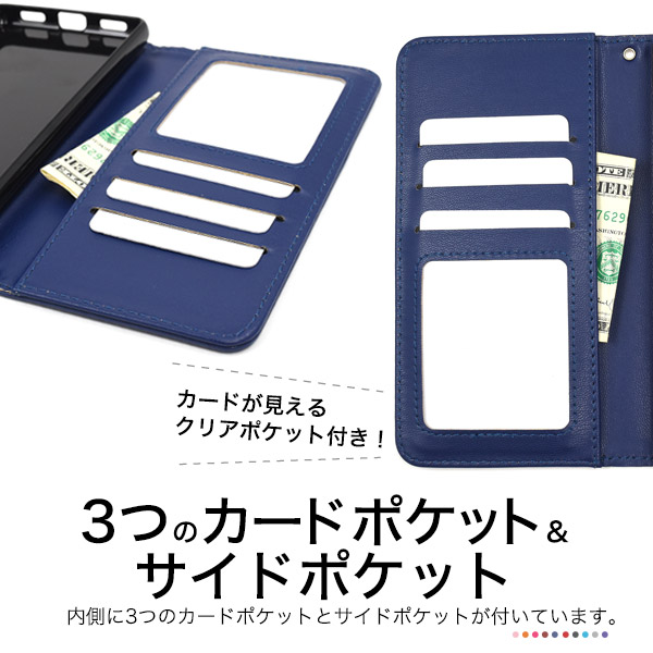 衝撃やキズなどから守ります。 また、内部はソフトケースなので着脱が簡単です。 背面を折り返すとスタンドとして使用できるので、動画視聴に便利です。 落下防止に最適なストラップとストラップホール付きです。 横開きタイプなので、手帳のように使うことができます。 また、内側に3つのカードポケットとサイドポケットが付いています。 | ||||||||||||||