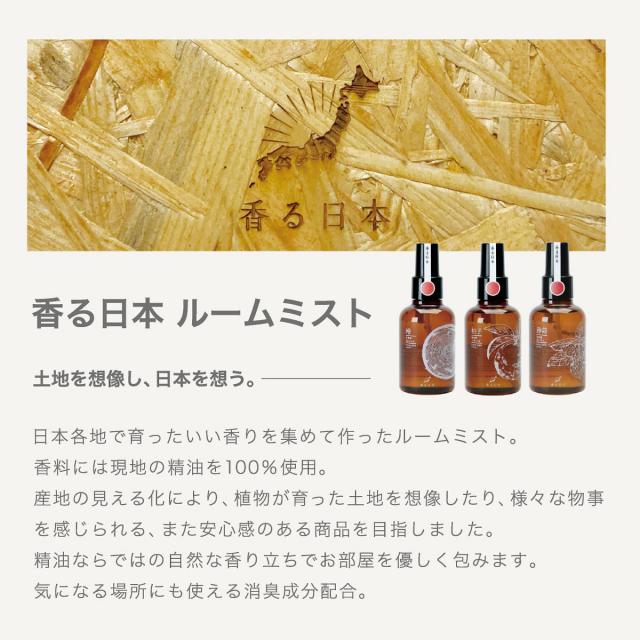 ![]() ■香る日本 ルームミスト 商品詳細 日本各地で育ったいい香りを集めて作ったルームミスト。 香料には現地の精油を100%使用。産地の見える化により、 植物が育った土地を想像したり、 様々な物事を感じられる、また安心感のある商品を目指しました。 精油ならではの自然な香り立ちでお部屋を優しく包みます。 気になる部分にも使える消臭成分配合。 日本で育った、香りと暮らす。 ここ日本には多くの植物が生息しています。 その土地特有の植物や、また同じ植物でも気候や環境等により異なる特徴を持つものが生まれます。 「香る日本」ではそんな地域特有の植物に注目し、生産者の想いやその土地、取り組みなどを、香りを通して実感してもらいたいと思っております。 植物が、香りが育つ、日本の恵みを感じてみてください。 |