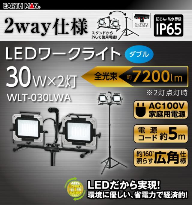 EARTH MAN LEDワークライト スタンド式 ダブル 30W WLT-030LWA 送料無料 家庭用 電動工具 作業灯 投光器 照明 ライト LEDライト 薄型 コンパクト スタンド式 2WAY DIY アースマン
