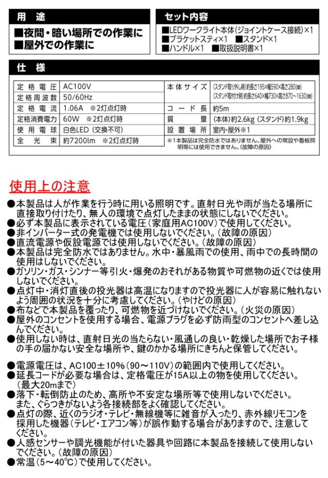 夜間・暗い場所での作業に、屋外での作業に。 ●2way仕様:スタンドから外して使用可能 ●ワンタッチでらくらく脱着 ●高さ調節可能:約870〜1630mm ●約160°照らす広角仕様 ■そのほかの作業灯・投光器はこちら↓ 作業灯・投光器 |