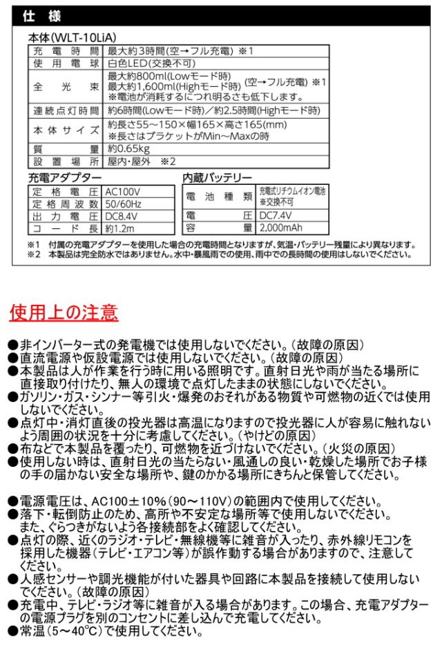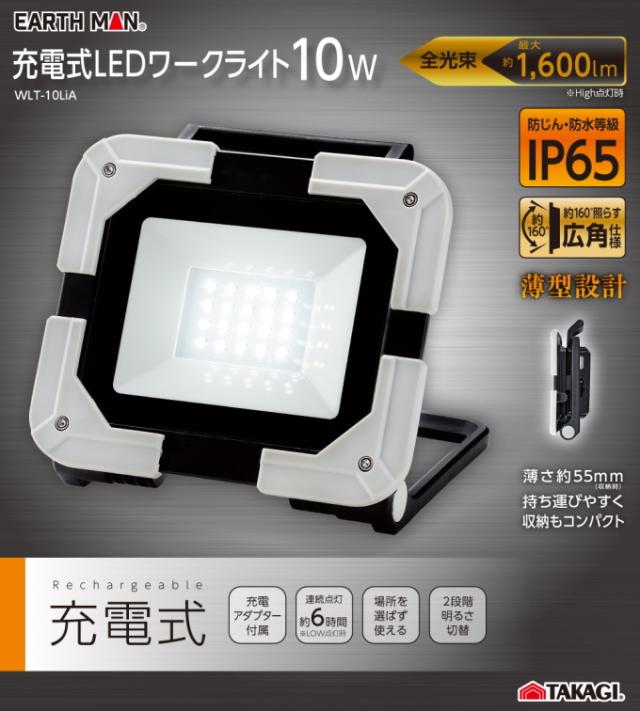 EARTH MAN 充電式 LEDワークライト 10W WLT-10LiA 送料無料 家庭用 電動工具 作業灯 投光器 照明 ライト LEDライト 充電式 薄型 コンパクト DIY アースマン
