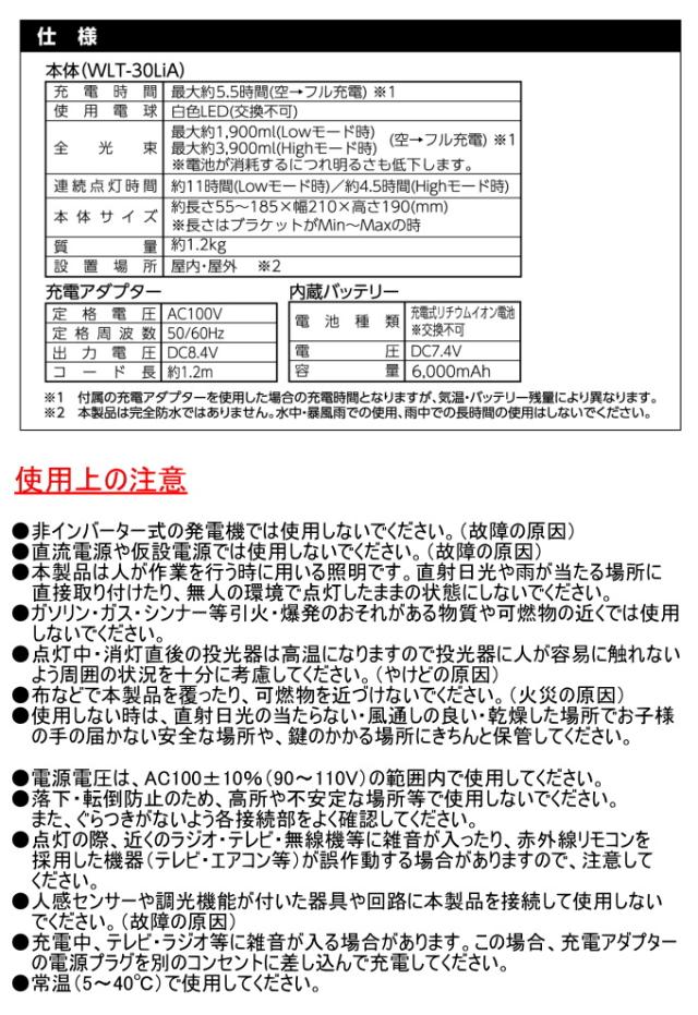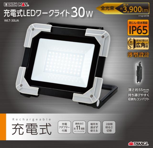 EARTH MAN 充電式 LEDワークライト 30W WLT-30LiA 送料無料 家庭用 電動工具 作業灯 投光器 照明 ライト LEDライト 充電式 薄型 コンパクト DIY アースマン