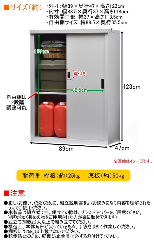 外寸:(約)幅89×奥行き47×高さ123cm(重量約25.4kg) 内寸:(約)幅88.5×奥行き37×高さ118cm 有効開口部:(約)幅37×高さ113.5cm 自由棚サイズ:(約)幅88.5×奥行き35.5cm(重量約1.5kg) |