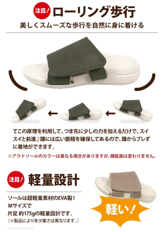 つま先とかかとの底が丸い形状でスイスイ前に進むローリング歩行を実現。 高低差がほとんどなく、快適に履けるソール形状です。 EVA素材を使用しているので驚くほど軽い!長時間の歩行でも疲れにくく歩くのが楽しくなります。 アッパーを取り外して丸洗いが可能!清潔に保てるのが嬉しい!