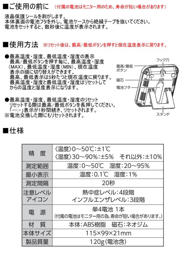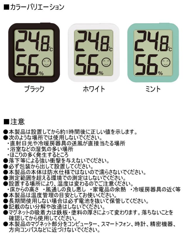 熱中症、インフルエンザの注意レベルをアイコンと文字でお知らせします。 最高温度・湿度、最低温度・湿度の表示切替ができます。 スタンドで置型、フック穴で壁掛け、マグネットで金属などに取り付けられます。 インテリアに馴染むシンプルなデザインなので場所を選ばずにお使いいただけます。 読み取りやすい大型液晶表示を採用しました。 ブラック・ホワイト・ミントの3色からお選びください。 ※お使いのモニターの設定や環境等により、WEB画像と実物とでは色合いが異なることがありますがご了承ください。 |