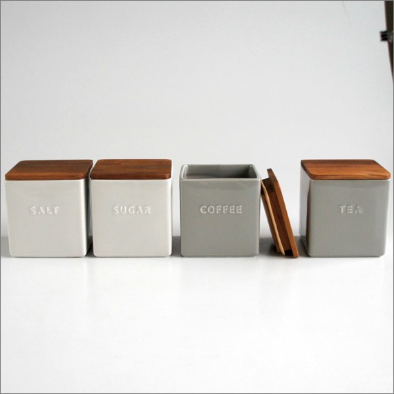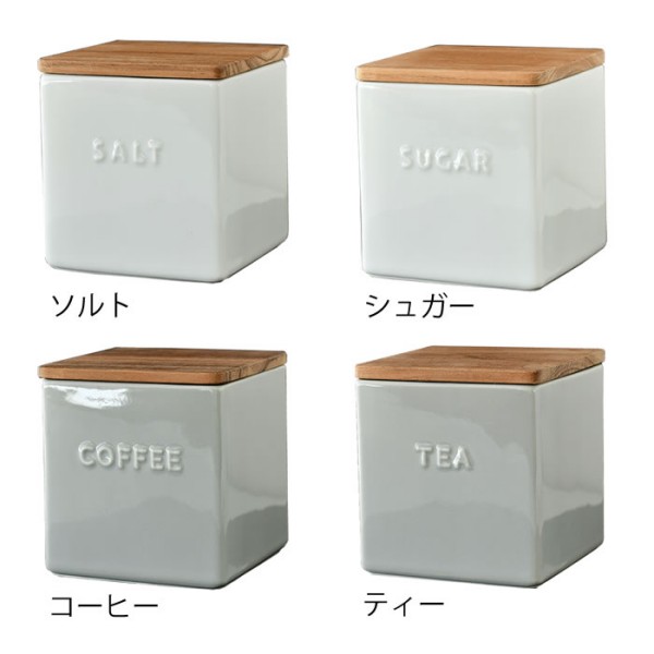 キャニスターには「SALT」「SUGAR」「TEA」「COFFEE」 と文字が入っています。