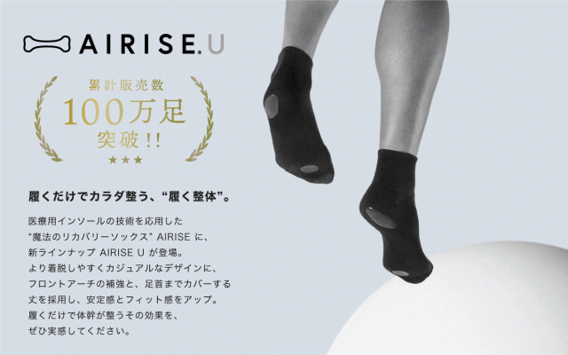 この「エアライズ」は理学療法士が考案したもので、特許取得(特許2017-222559)の足裏に設置した2つのシリコンパッドにより、身体にかかる急激な負荷を軽減し、「正い歩き方・立ち方」へ修正し、体重移動をスムーズにし、運動によるパフォーマンスをサポートするための「体幹サポートソックス」として登場。