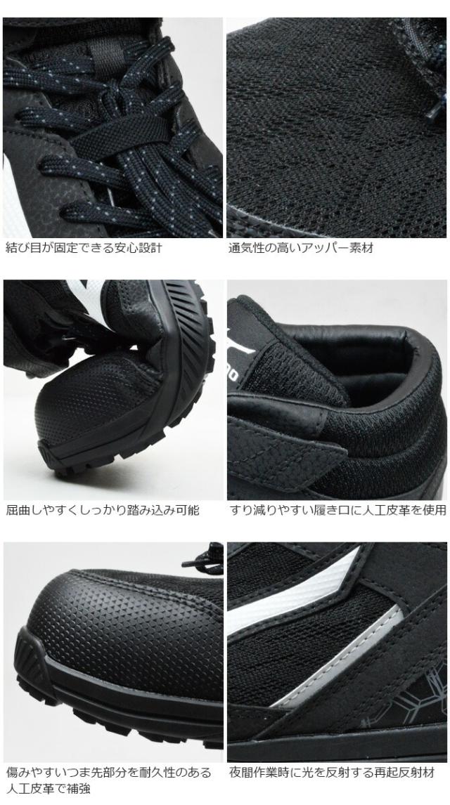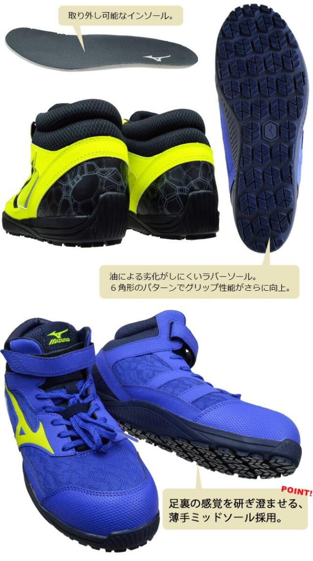 | ミズノの通気性が高いハイカットタイプの安全靴です。 アッパーにはメッシュを使用し、ベロは通気性のある構造でムレにくく快適です。 傷みやすいつま先部分は、足をしっかり保護する樹脂先芯と耐久性のある合成皮革で補強しています。 足裏の感覚が伝わるように前部分を薄くしたソールは耐油性にも優れ、滑りにくく、軽くて曲げやすい、作業に適した設計です。 ソールは横部分を厚めに構成しているので横からのあたりに強く、すり減りやすいかかとは強いラバーを使用しています。 一部に再帰反射材を使用し、夜間の作業でも安心です。 細部にもこだわり抜いたミズノ渾身のセーフティーシューズです。 【JSAA規格 A種 認定品】 | ||||||