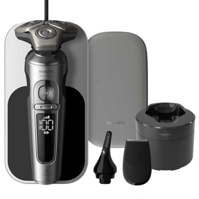 付属品:シェーバー本体+シェービングユニット、取扱説明書、グローバル保証書、ワイヤレス充電パッド、USB電源アダプタ、クイッククリーンポッド、クイッククリーンポッドカートリッジ、プレミアムポーチ、トリマー、鼻・耳毛トリマー