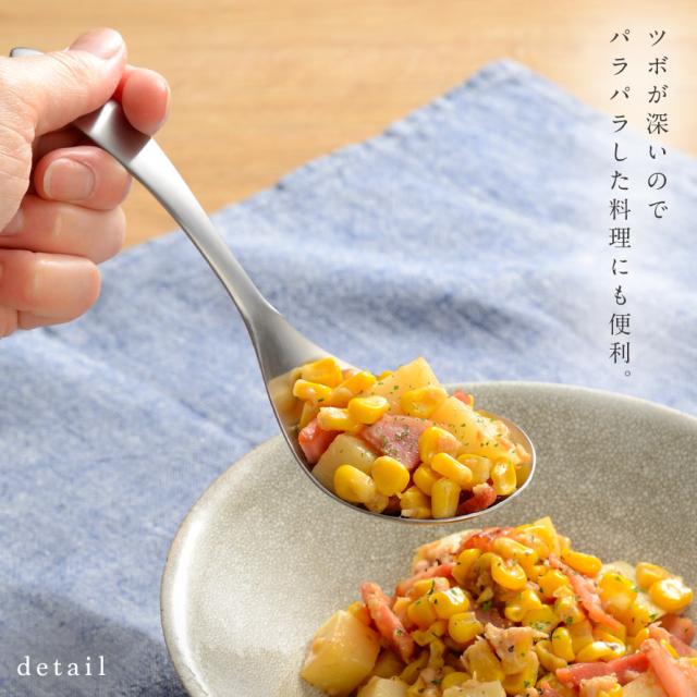 パラパラしたバターコーンなどの細かいものや大皿料理の取り分けにも最適です。長芋とろろや、自家製ドレッシングなど、タレをかけるときなどにもおすすめです。ヨーグルトやゼリー、スコップケーキなど、デザートも一度にたっぷり盛り付けられます。