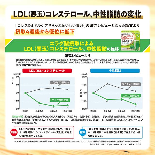 コレステロールや中性脂肪が気になる方に●コレス&ミドルケア さらっとおいしい青汁は、LDL(悪玉)コレステロールと中性脂肪を低下させるエラグ酸を配合した機能性表示食品です。