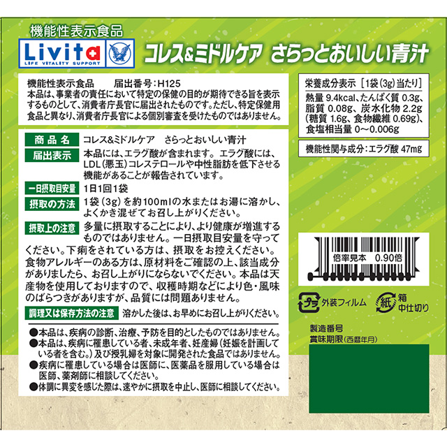 大正製薬 コレス&ミドルケア青汁 30日分 30袋 機能性表示食品 リビタ 大麦若葉 国産 コレステロール 中性脂肪が気になる方 エラグ酸
