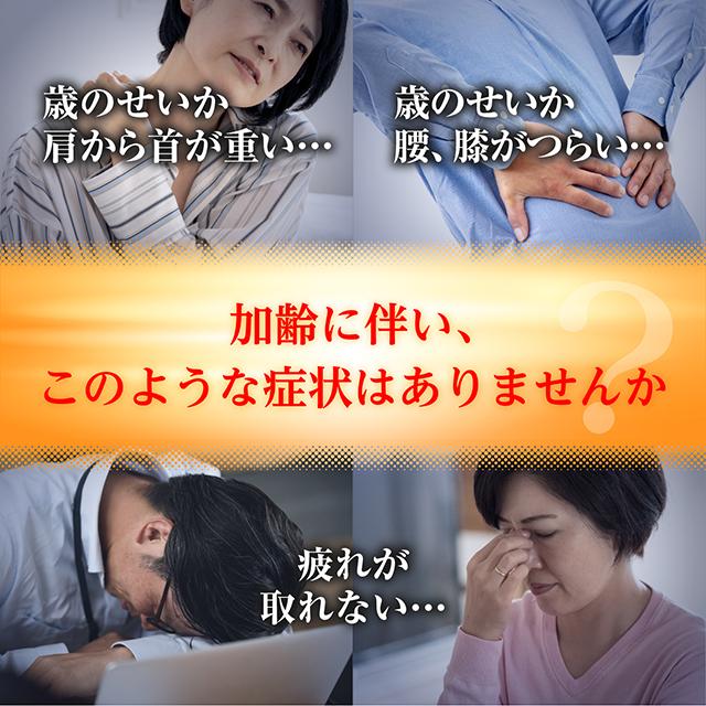 虚弱体質(加齢による身体虚弱を含む。)に伴う身体不調の改善・予防:疲れやすい・疲れが残る・体力がない・身体が重い・身体がだるい、肩・首・腰又は膝の不調、寝付きが悪い・眠りが浅い・目覚めが悪い、肌の不調(肌荒れ、肌の乾燥)、冷えやすい・血行が悪い、胃腸が弱く腹痛や下痢を起こしやすい