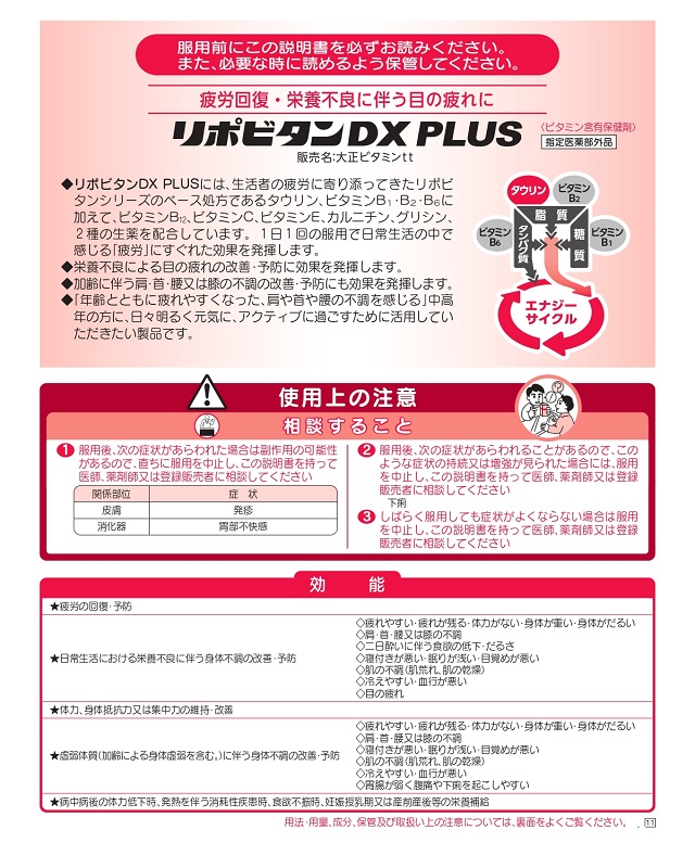 商品名 リポビタン DX PLUS 270錠 【指定医薬部外品】 大正製薬 ブランド リポビタン メーカー 大正製薬 種類 DX PLUS 容量 270錠 使用期限 製造日から1080日 区分 指定医薬部外品 効果・効能 疲労の回復・予防