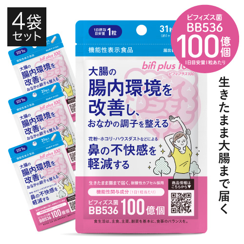 ビフィズス菌サプリ BB536 100億 ラクチュロース 花粉 ホコリ ハウスダスト による鼻の不快感 軽減 大腸の腸内環境を改善 機能性表示食品 腸内フローラ おなかの調子を整える 腸内環境サプリ ビフィズス菌 サプリ 花粉対策 医師監修 ビフィプラス100 31粒 4袋セット メール便