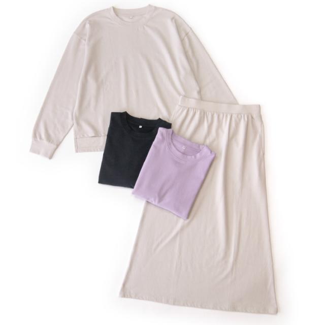 ボトムスは足元を邪魔しないスカート、トップスは前後裾違いでさりげないおしゃれ感です。