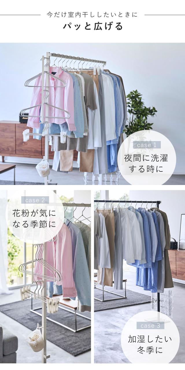 雨の日や夜に洗濯する時、花粉や黄砂がひどい時など、室内で洗濯物を乾かしたいタイミングで簡単に設置することができます。