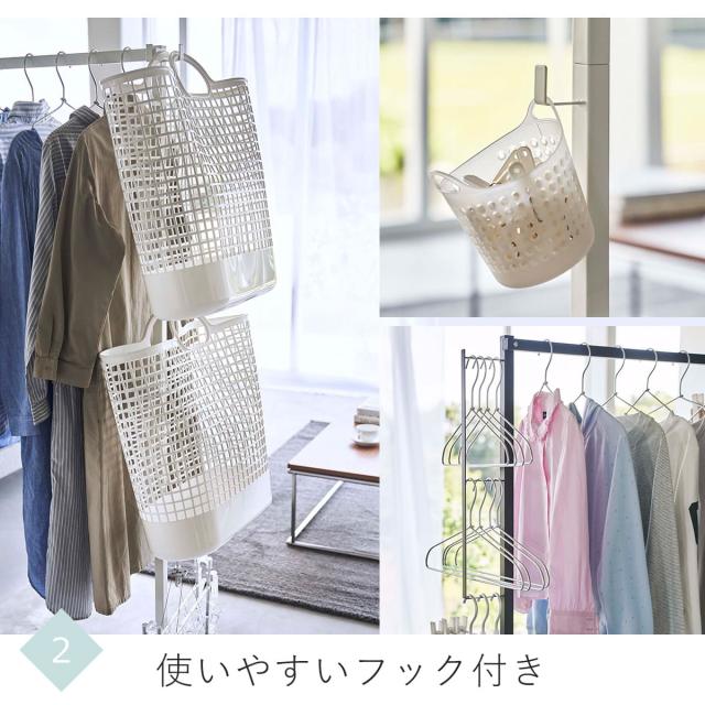 それぞれの支柱に複数のフックが付いています。洗濯かごやハンガーの他、帽子やバッグなどを掛けることができ、洗濯グッズもまとめて収納できます。
