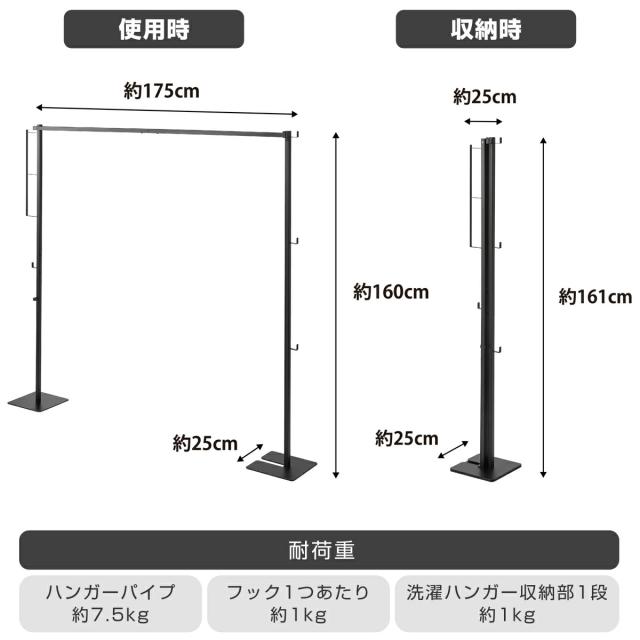 | サイズ | 約 幅175×奥行25×高さ160(cm) 収納時:約 幅25×奥行25×高さ161cm ハンガーパイプ:約 幅150×高さ159cm |