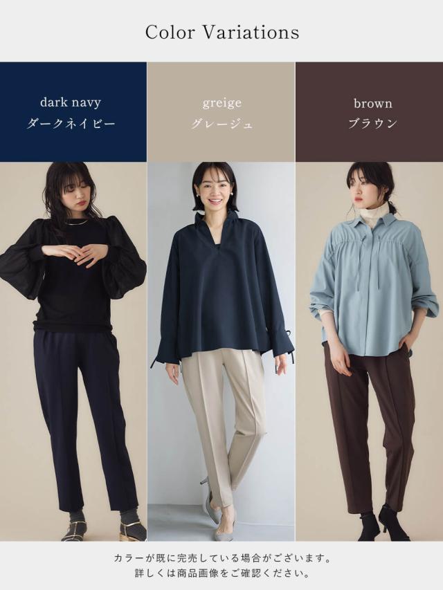 センターシームが足を真っすぐに見せながらきちんと感を演出するので、通勤から普段使いまで幅広く使えます。ウエストはアジャストゴムでサイズ調整ができ、妊娠初期から産後まで長く使えます。