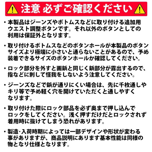 ・本製品はジーンズやボトムスなどに取り付ける追加用ウエスト調整ボタンです。それ以外のボタンとしての利用は保証外となります。