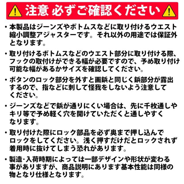 ・本製品はジーンズやボトムスなどに取り付けるウエスト縮小調整アジャスターです。それ以外の用途では保証外となります。