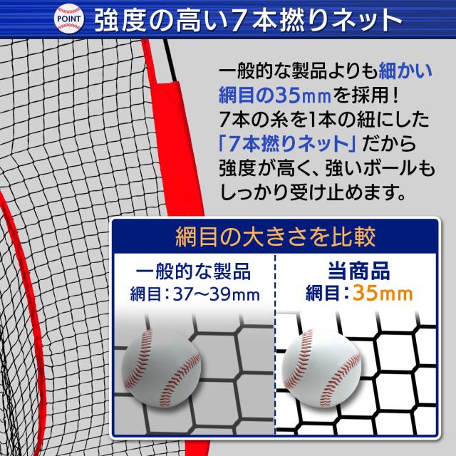 【野球トレーニングに特化した造り】打ち損じがあっても、ボールが飛び出にくいように安心の2×2mサイズを採用。また「2種類のフレーム」と「7本撚りのネット」にしたことで、頑丈な野球ネットになっています。
