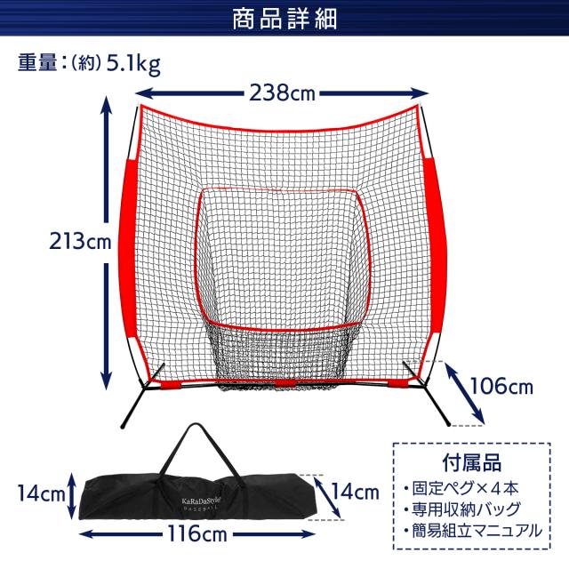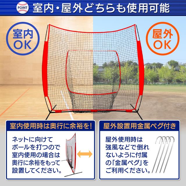 【室内でも屋外でも使用可能】組み立て簡単で持ち運びもしやすい野球ネットは屋外・室内問わずにご利用いただけます。※室内で利用する場合は十分なスペースを確保してから行ってください。※設置する際は、付属のペグか重り置いてご利用いただくことを推奨いたします。
