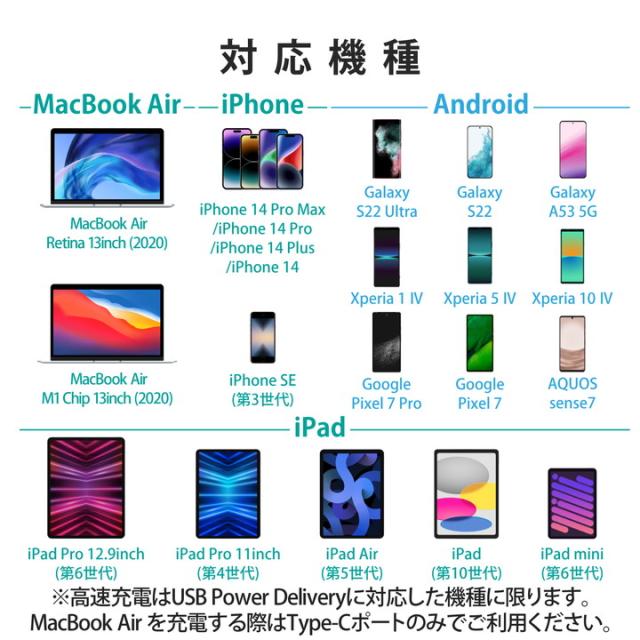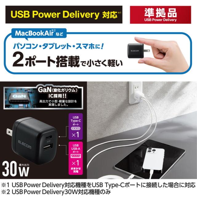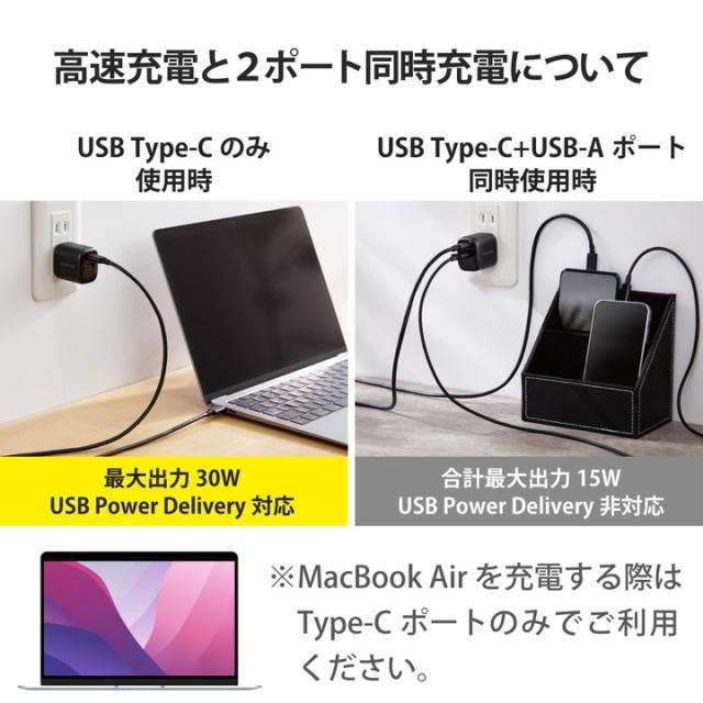 USB Type-C(TM)ポートとUSB-Aポートの合計2ポートを搭載し、GaN(窒化ガリウム)を採用した小型で軽量、かつ高出力なUSB AC充電器です。本製品のUSB Power Delivery最大出力は30Wです。USB Type-C(TM)ポートは、USB Power Deliveryに準拠し対応するノートパソコンやスマートフォン、タブレットなどを超高速充電が可能です。USB-Aポートは最大出力12W(5V/2.4A)で、“おまかせ充電”に対応しています。