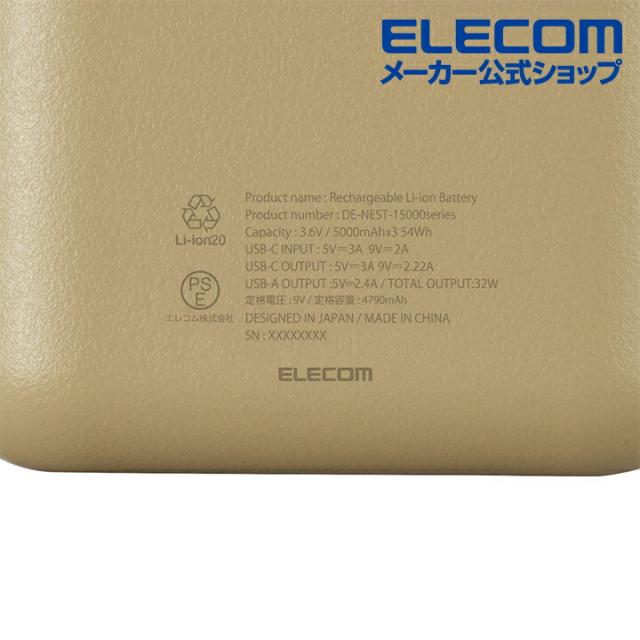エレコム モバイルバッテリー NESTOUT 15000mAh 小型 32W C×1+A×2 アウトドア サンドベージュ┃DE-NEST-15000BE