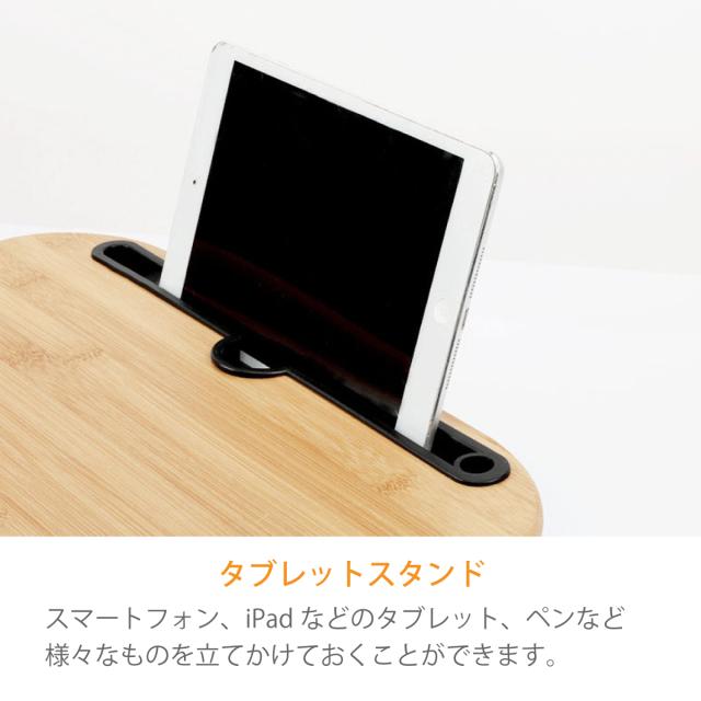 スマートフォン、iPadなどのタブレットやペンなど様々なものを立てかけて置くことができるタブレットスタンドが付いています。