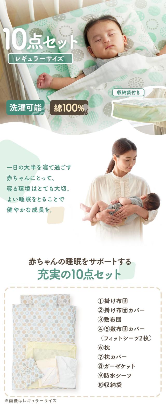 ベビー布団 セット ベビー布団セット レギュラーサイズ ベビー組ふとん10点セット レギュラーサイズ ドット 全2色 掛け布団 掛け布団カバー 敷き布団 敷き布団カバー 枕 枕カバー ガーゼケット 防水シーツ 収納袋 綿100% 洗濯可能 送料無料