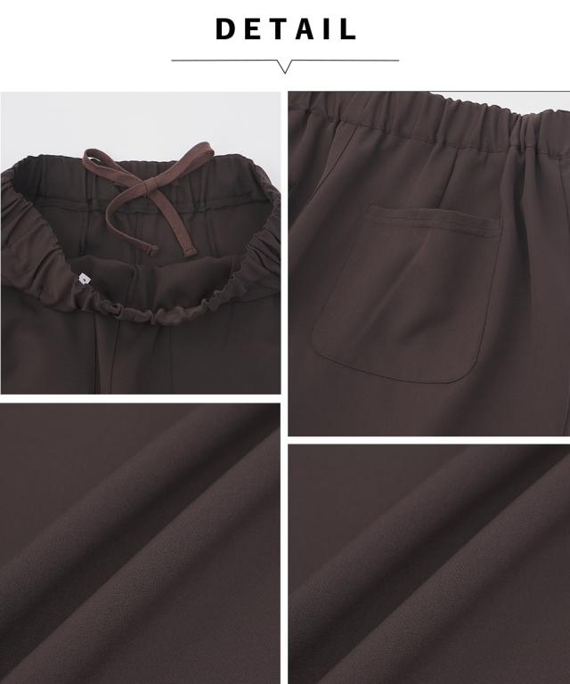 品質:ポリエステル95%・ポリウレタン5%(織物 平織) 透け感:なし 伸縮性:あり 生地の厚み:普通 光沢感:ややあり ポケット:あり(前2・後2) ウエスト:総ゴム 季節:春・秋向き シルエット:ワイド 原産国:中国製 洗濯表示:洗濯機OK ネット使用