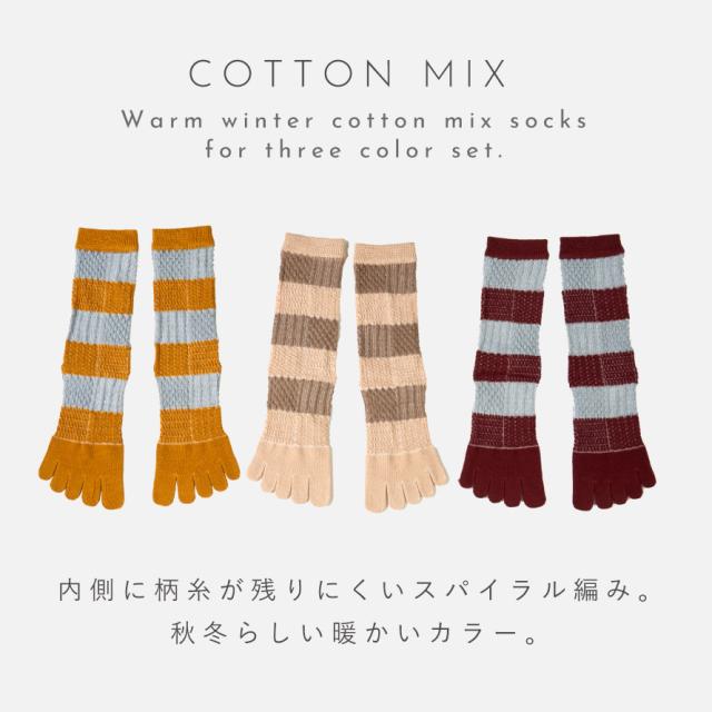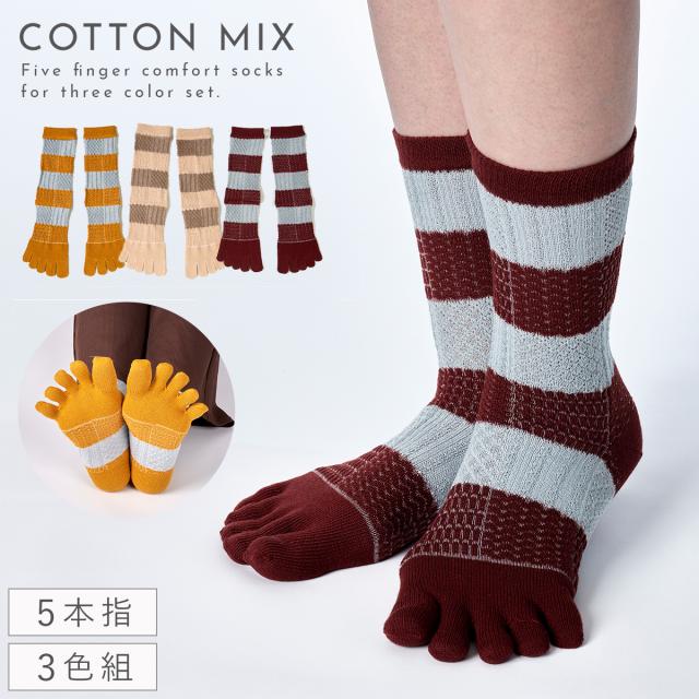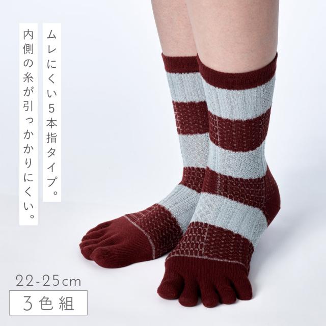 靴下,くつした,くつ下,ソックス,レディース,女性,大人,女性用,婦人用,婦人靴下,五本指ソックス,五本指靴下,五本指,5本指,蒸れない,ムレにくい,クルー丈,秋冬,秋,冬,つま先,かかと,補強,丈夫,3足組,セット,おしゃれ,お洒落,オシャレ,ファッション,コーディネート,カジュアル,かわいい,可愛い,22-25cm,22cm,22センチ,23cm,23センチ,24cm,24センチ,25cm,25センチ,ボーダー,エンジ,レッド,赤,ベージュ,カラシ,マスタード,イエロー,黄色,