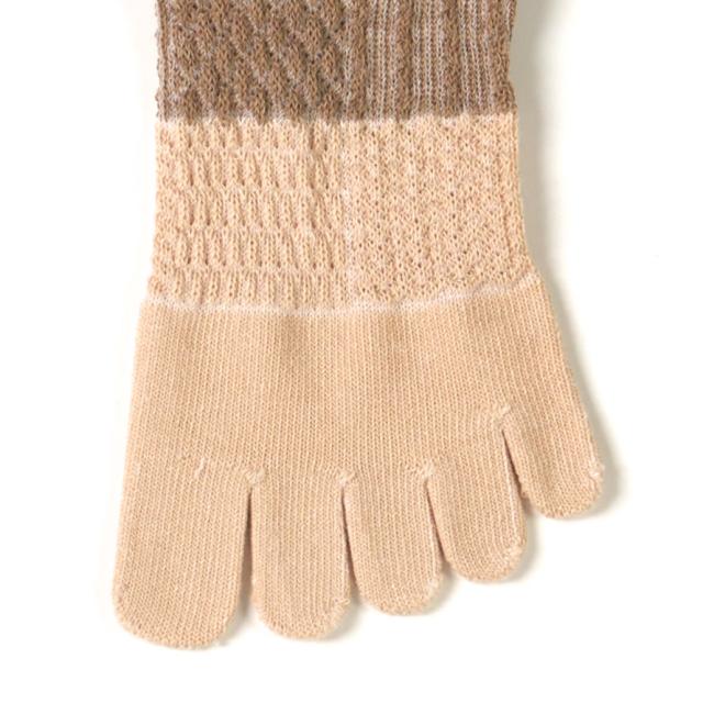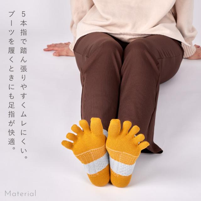 内側に柄糸が残りにくいスパイラル編み。着用時に糸が引っかかりにくい5本指ソックス。5本指タイプで、踏ん張りやすくむれにくい。ブーツを履くときにも足指が快適。かかと付きなのでずれにくく履き心地◎。
