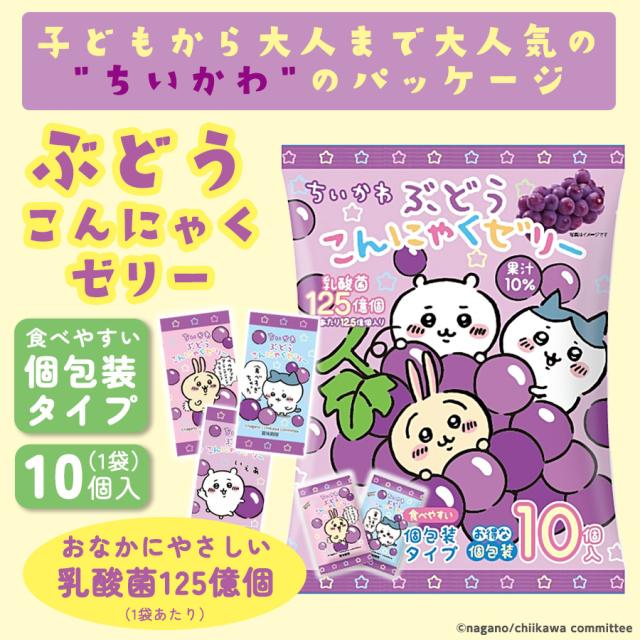 | ちいかわパッケージの果汁10%ぶどう味こんにゃくゼリー10個入り。可愛い「ちいかわ」のキャラクターがデザインされているひとくち個包装タイプで、お子様のおやつや小腹が空いたときなどにもオススメです。1個あたり乳酸菌12.5億個入りで、おなかにやさしく手軽に食べられます。 |