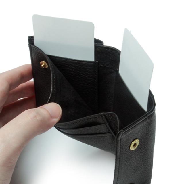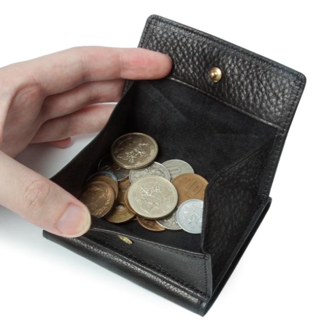 | 商品の特徴 カードポケットの数は全部で4枚分。カードポケット裏側にフリーポケットを備えています。スナップボタンで開く本体開閉口とは別で、ボックス型の広々とした小銭ポケットは外付けになっているのでかさばりにくい構造です。 |