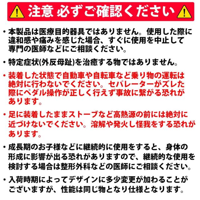 ・装着した状態で自動車や自転車など乗り物の運転は絶対に行わないでください。セパレーターがズレた際にペダル操作が正しく行えず事故に繋がる恐れがあります。