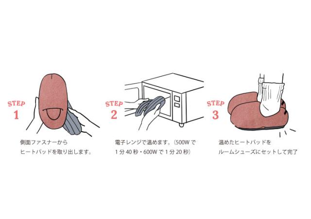 STEP1・・・側面ファスナーからヒートパッドを取り出します。STEP2・・・電子レンジで温めます。(500W で1 分40 秒・600W で1 分20 秒)