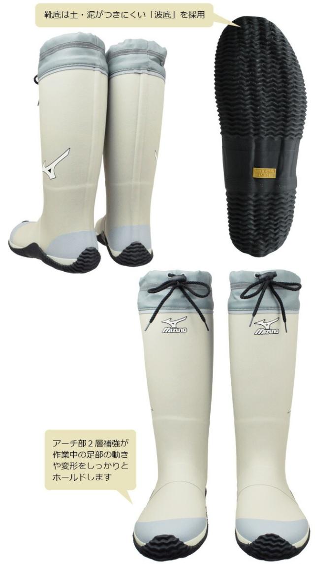 軽量ラバーを採用しながら20万回の屈曲試験に合格する耐久性を兼ね備えており、靴底は土や泥がつきにくい「波底」の採用で、泥場での作業も快適にこなせます。