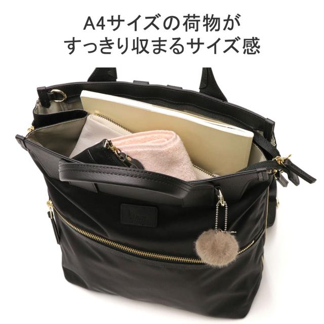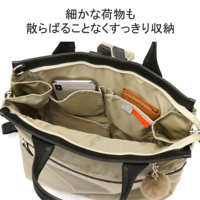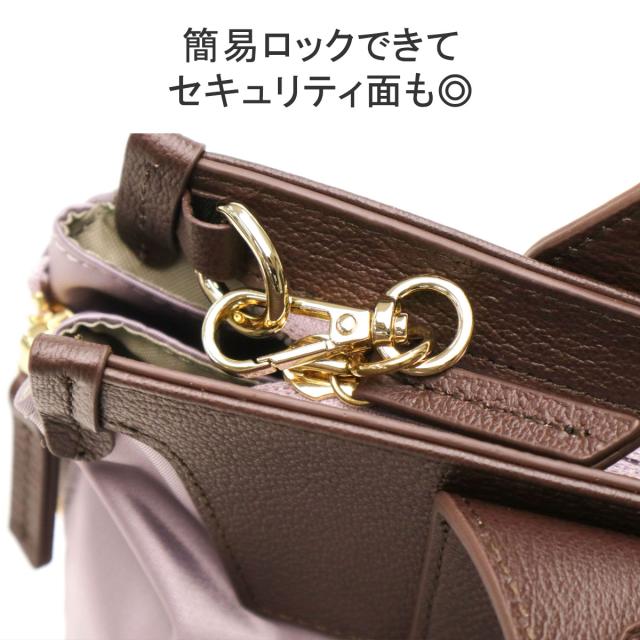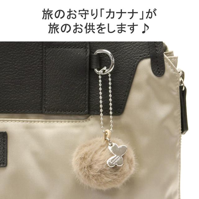 | 仕様 | <外側> ジップポケット(M)×1 └ 内蔵 ポケット(XS)×1 ジップポケット(M)×1 スナップポケット(S)×1 <内側> ジップポケット(L)×1 ポケット(S)×2 ボトルホルダー×1 <付属品> チャーム(お守り)×1 |