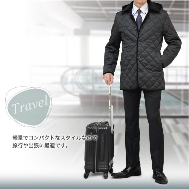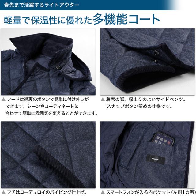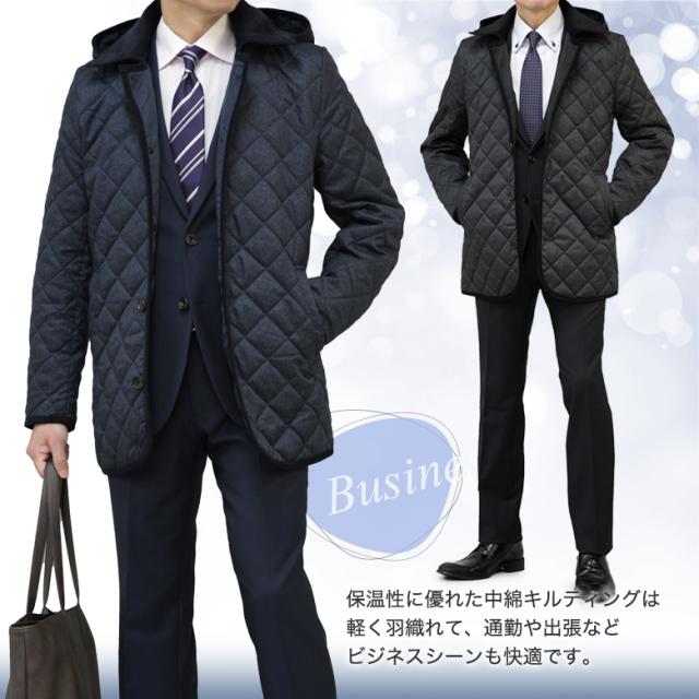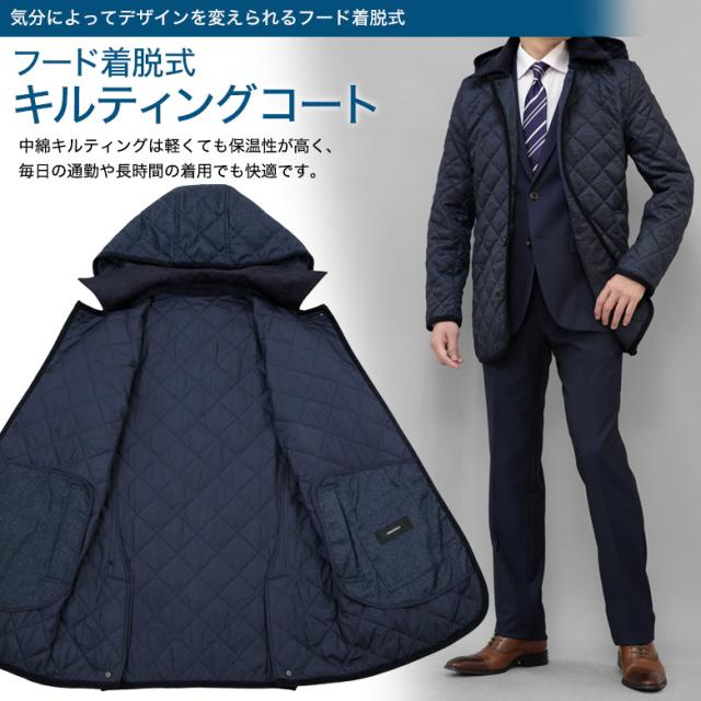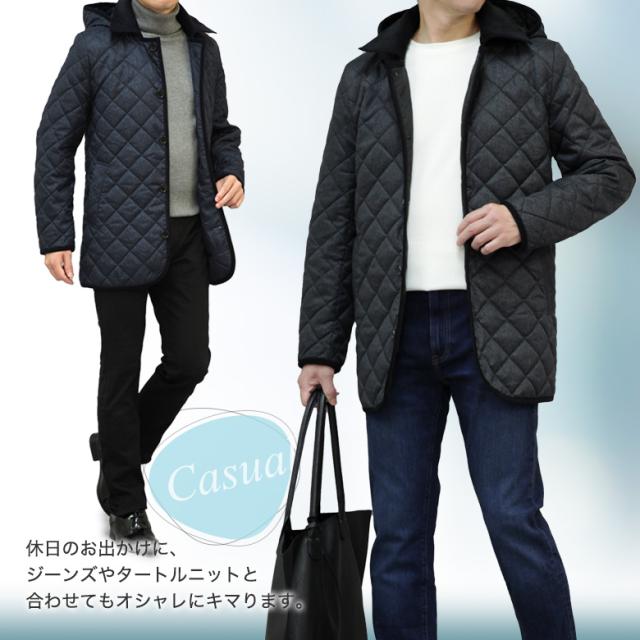 カジュアルからビジネス・通勤にまで対応できる、大人のアウター・キルティングジャケット ダイヤキルトの上品なルックス。カジュアルだけでなく通勤などビジネスウェアにもお勧め。ジャケットの上から着ても着やすい設計。スーツの裾が隠れる着丈の設計となっています。 フードは着脱可能で着こなしの幅も広がります。
