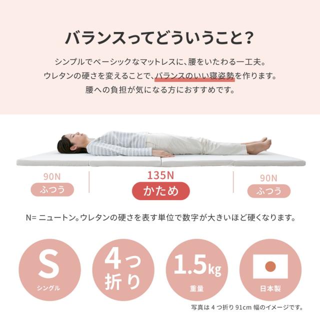 腰をいたわる一工夫 バランス 四つ折りマットレス シングル 【送料無料】 折りたたみ 日本製 軽量 厚さ5cm 薄型 軽量 かため 腰痛 敷布団