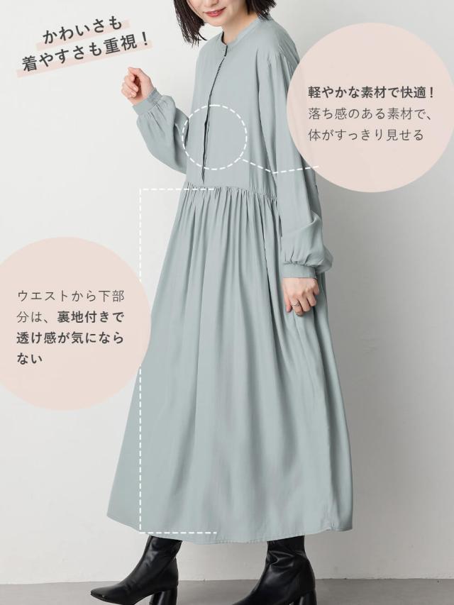 着た時のシルエットの美しさや微光沢素材でクラス感を演出。シンプルに見えて上品な着こなしが完成する万能な1枚です。脚長効果大な胸下切り替えは、たっぷりギャザーを入れてお腹のラインもカバー。バンドカラーと比翼仕立ての前立てが、きちんと感を演出してくれます。