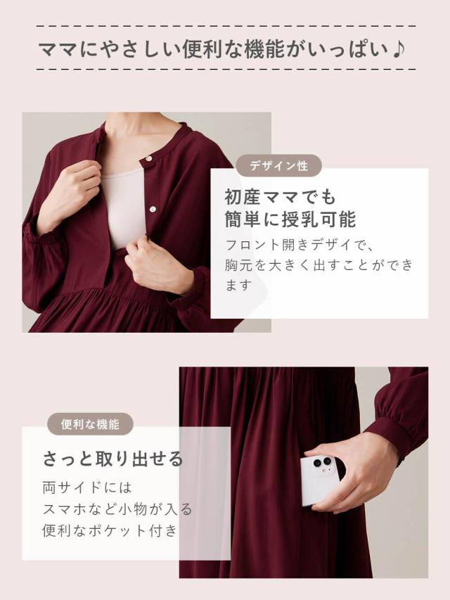 マタニティ ワンピース 長袖 前開き ウエスト切替 ギャザー ワンピース 産前 産後 妊婦 授乳 授乳服 妊婦服 オフィス 仕事服 通勤 無地
