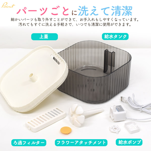 給水タンク/給水ポンプ/上蓋/ろ過フィルター/フラワーアタッチメント/モーター掃除用ブラシ/ピンセット