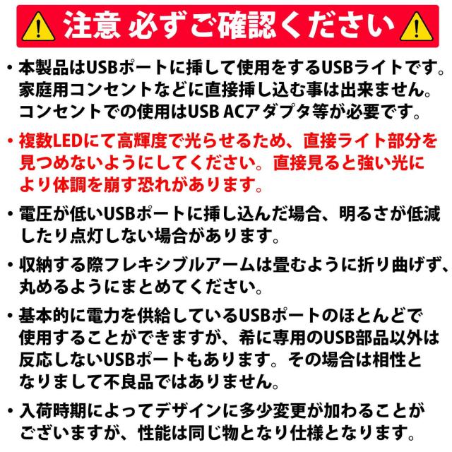 ・本製品はUSBポートに挿して使用をするUSBライトです。家庭用コンセントなどに直接挿し込む事は出来ません。コンセントでの使用はUSB ACアダプタ等が必要です。